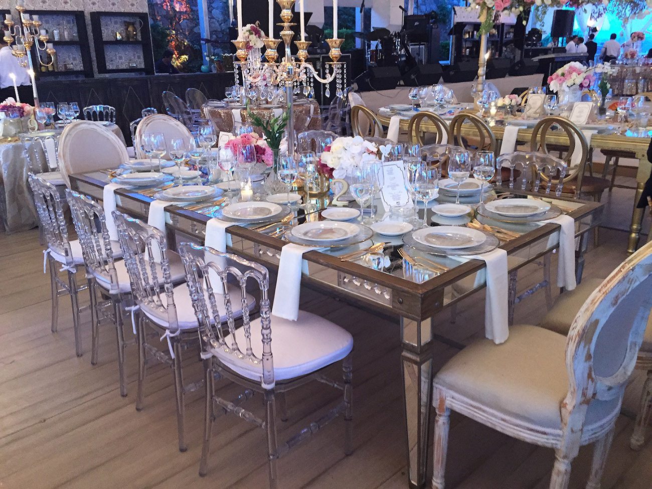 Esta boda fue en el increíble lugar San José La Vista, a un costado de la capilla.  Se uso silla Versalles dorada y silla Alice pop y Versalles transparente con mesas de cristal, mesas redondas y cuadradas.