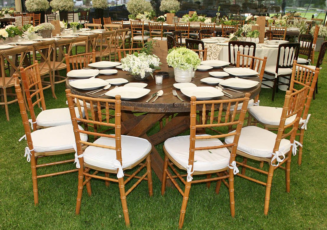 Boda de día en jardín en San Luis Potosí, mezcla de mesas carrete con mesas imperiales de madera de diferentes tonos de café.  Se usaron sillas crossback miel y crossback chocolate.  La pista de baile tambien fue de tono beige claro con lineas grises.
